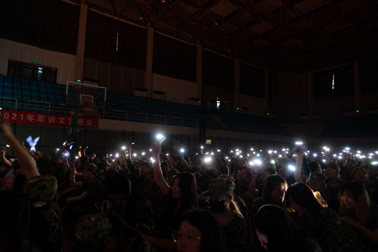 街舞《朝气军营》以激情酷炫的舞姿打开了这场听觉和视觉盛宴,青春的气息迅速点燃全场,赢得同学们的喝彩与互动。古筝表演《战台风》,不仅让同学们感受了中国文化的博大精深,也深刻体悟工人阶级顽强拼搏的精神和战神困难的气概。小游戏“听歌词猜歌曲”调动起了全场观众的参与热情,《我的中国心》、《中国军魂》、《我爱你中国》等铿锵有力的歌词,描绘了一幅幅中国波澜壮阔的画卷,激励同学们把爱国情、强国志、报国行融入今后的学习生活中。诗歌朗诵《红色的七月》、格斗表演《擒敌拳》、大合唱《我和我的祖国》等精彩纷呈的节目打动了现场观众,纷纷挥舞手机,喜悦之情溢于言表。“那一年西藏的冬天雪很厚,连长带着我们徒步巡逻……”伴随着刘虹志教官低沉的嗓音,同学们陷入沉思,正是因为有千千万万像他们一样的护国卫士的负重前行,我们才能拥有岁月静好的幸福生活。