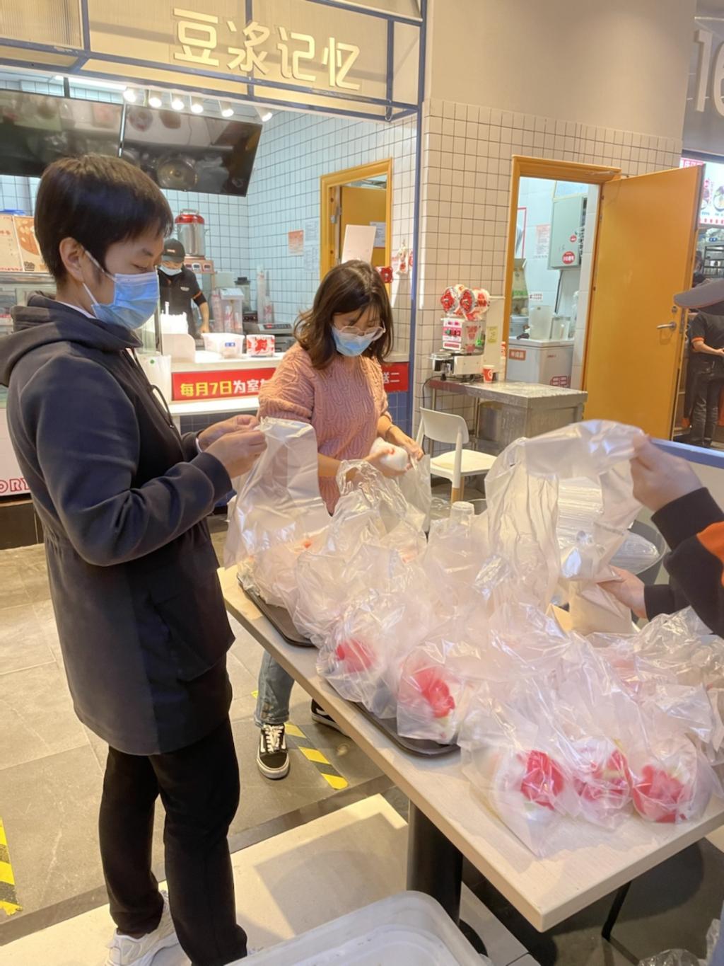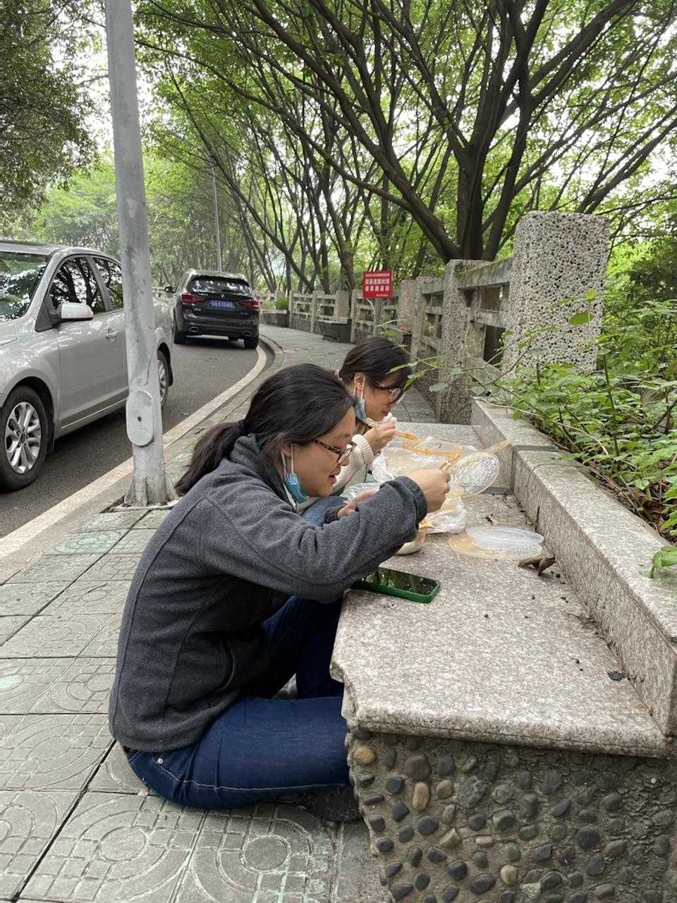 在每天的清晨、中午、傍晚,辅导员们奔走于食堂与员工寝室之间,忙碌在配餐送餐第一线。为了确保同学们能准时吃上热气腾腾的饭菜,辅导员们早早做好准备,配餐、打包、装箱、搬运、清点数量,以最快速度把食物送到员工宿舍楼栋。直到全部送餐工作结束,他们才到路边的石凳上草草用餐,然后急忙从“送餐员”变回辅导员,继续投入战斗。