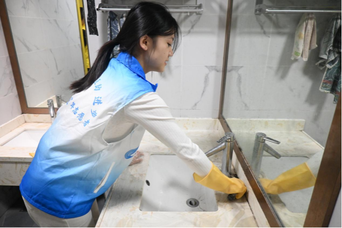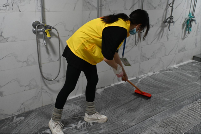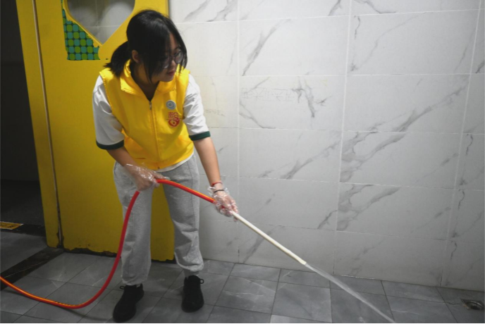 干净整洁的环境对于孩子们的成长尤为重要,因此本次活动以协助打扫园内卫生间清洁卫生为主。志愿者们分为多个小组,部分志愿者进入厕所,将蹲厕内外污渍清理干净;部分志愿者用钢丝球清理洗手台上的水渍;还有一部分志愿者用拖把拖洗地板,使其干净整洁。经过志愿者们的打扫,园区的环境卫生得到改善。志愿者们用实际行功诠释了劳动的价值,向孩子们传递了"劳动创造美好"的积极态度。