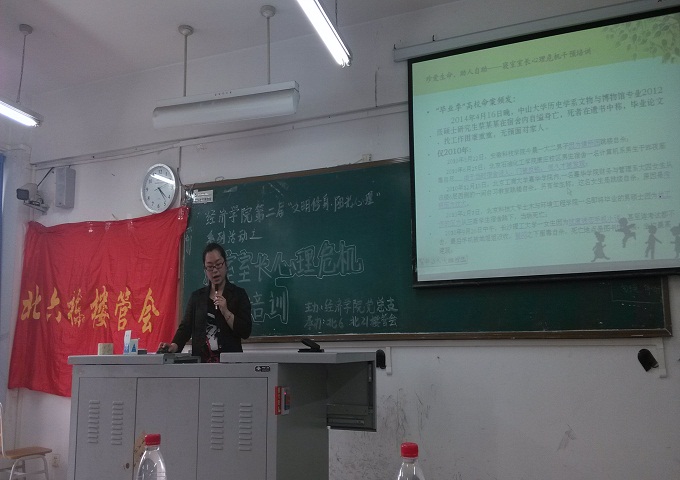 2014年5月9日下午四点,在博智楼7312教室,举行了由经济公司党总支主办、北6和北21楼管会承办的伟德国际bevictor1946第二届“文明修身,阳光心理”系列活动启动仪式暨珍爱生命、助人自助——寝室室长心理危机干预培训会”。本次活动由郝颖老师主讲,经济公司党总支书记张筱璐、公司2011和2012级的寝室室长以及各层楼栋干部参与了本次活动。