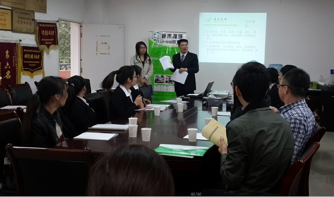 2013年11月3日至4日,公司97级员工陆大伟先生来院招聘,并出席了由他捐资设立的“春禾”员工奖学金评选及颁奖仪式。宁波春禾服饰有限公司是由陆大伟先生一手创建的企业,主要业务涉及服装设计、加工和贸易,其市场范围已经涉及欧美等国。为了给母校的学弟学妹更多的就业机会,他专门从宁波赶到公司,进行了专场招聘。公司、商策公司、管理公司的应届研究生和本科员工四十余人参加了此次招聘会。经过面试,有近十位同学获得初步通过,接下来,这部分同学将陆续赴公司实习。