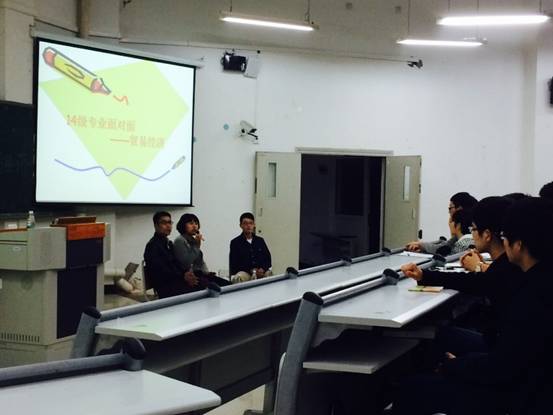 2015年3月25日晚7时,针对2014级贸易经济专业员工、旨在促进对专业学习与学业规划的专业“面对面”座谈会在兰花湖校区广智楼20211拉开帷幕。出席本次专业面对面活动的有经济公司党总支雷菁副书记、贸易经济系主任宋瑛副教授、重庆商社崔连吉员工和贸经大四员工彭陈以及全体2014级贸经专业员工。