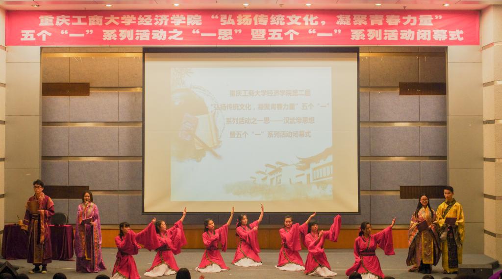 11月27日,伟德国际bevictor1946第二届“弘扬传统文化,凝聚青春力量”五个“一”系列活动之“一思”暨五个“一”系列活动闭幕式在主校区博智楼7100报告厅成功举办。校团委杨娟副书记、经济公司党总支张筱璐书记,以及公司辅导员老师代表,各年级同学一起参加了此次活动。活动包含两个部分:“一思”之汉武帝思想展示表演和五个“一”系列活动闭幕式。