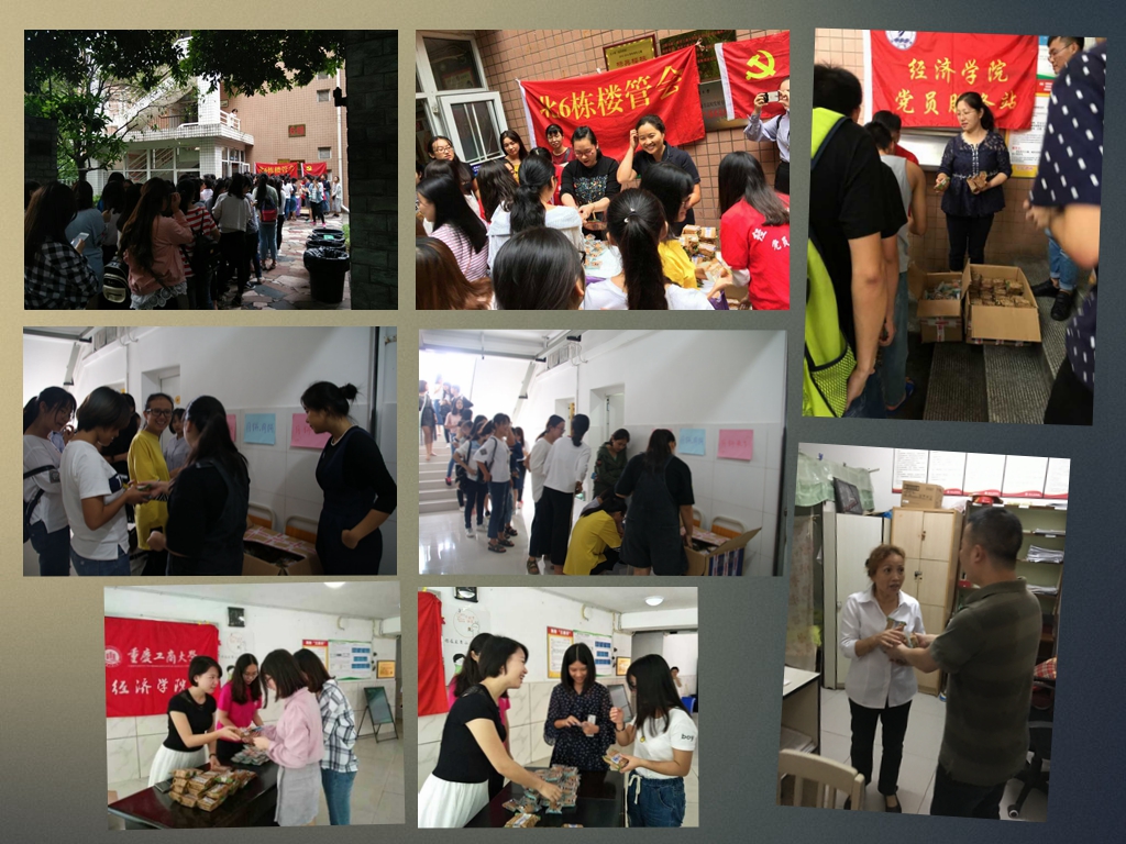 秋风送爽,明月皎皎,伴随着八月桂花香的阵阵香气,中秋佳节如约而至。为了迎接中秋佳节的到来,2017年9月22日经济公司党员服务站、分团委员工会、楼栋联袂在北六、北二十一、北十五(十六)、南二楼栋开展了一次中秋佳节发放月饼的送温暖活动。伟德国际bevictor1946分党委王小玲书记、于频副书记、党员服务站的指导老师郝颖老师和楼管会主任喻智成老师、邓雪霜老师、分团委书记蒋敏老师各自去楼栋亲自为同学们发放月饼。