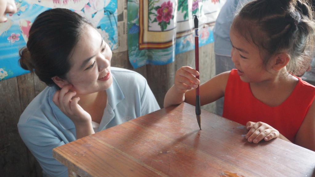 孩子们坐在课桌旁认真地跟着实践队员们学习,为丰富授课形式,实践队员利用手语教学使这首诗歌更加生动形象。面对第一次的手语教学,小朋友们很是新奇,全神贯注地学习并很快融会贯通。孩子们伸出合着的两只小手,并微微抬高张开,恰似一朵牡丹向阳绽放。