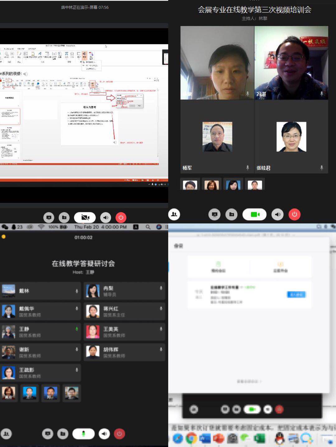 培训形式多样化。技术指导老师开展了形式多样的培训,经济系技术指导教师唐中林在企业微信上组织《如何在PPT中进行音频录播》培训视频会,通过课件展示、实操演示,给大家详细讲解音频制作、保存及播放问题,并就企业微信使用过程中的常见问题进行了一一解答。会展专业冯湛老师开展了在线教学系列讲座,重点讲解操作技巧,包括:创建课程基本信息、建立单元学习内容、上传教学资源、开学教学互动和课程活动、查看员工平台使用次数和完成度、手机版优慕课AAP使用等相关内容。国贸系王静老师则围绕在线教学的课前准备、课中讲授、课后指导三方面展开培训,并展示了公司在线教学平台的各项功能,对教学过程中可能遇到的问题和突发状况进行了探讨。贸经系王辉老师培训了如何使用屏幕分享、文件分享以及出现设备故障如何解决,解释了ppt录制和幕客使用中出现无法录制和投屏等问题。除此之外,各技术指导老师跟“一对一”帮扶对象随时保持联系,对出现的问题进行耐心答疑和交流。各位老师还在培训中模拟上课场景,进行现场演示,并就他们在演示过程中遇到的一系列问题进行了提问,培训老师进行逐一回答,大家共同讨论,对在线教学技术有了更深入的学习。