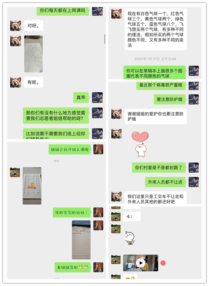 今年是伟德国际bevictor1946志愿者帮扶营盘村孩子们的第八个年头,每年如期而至的爱心包裹和暑期实地走访已经成为了孩子们的期待与牵挂。而如今在疫情防控的关键时期,志愿者们仍然坚持采用线上的方式开展教育扶贫和扶智工作,主要从心理和学习两方面对营盘村的孩子们进行线上指导。志愿者们通过微信、QQ、电话等方式对营盘村的孩子们给予远程的关心与问候,询问了解孩子们的衣食住行,以及疫情期间家里的生活现状,实时关注每一位孩子的心理感受并适当鼓励支持。同时向孩子们传播正确的疫情知识,让他们能够了解并做好有效的防护措施;耐心细致对孩子们进行线上功课辅导,让孩子们停课不停学。