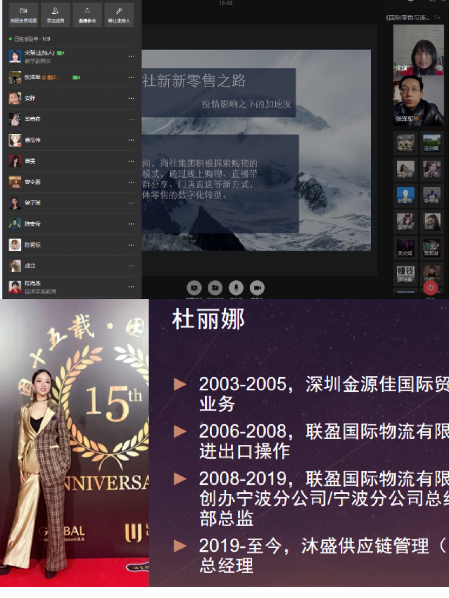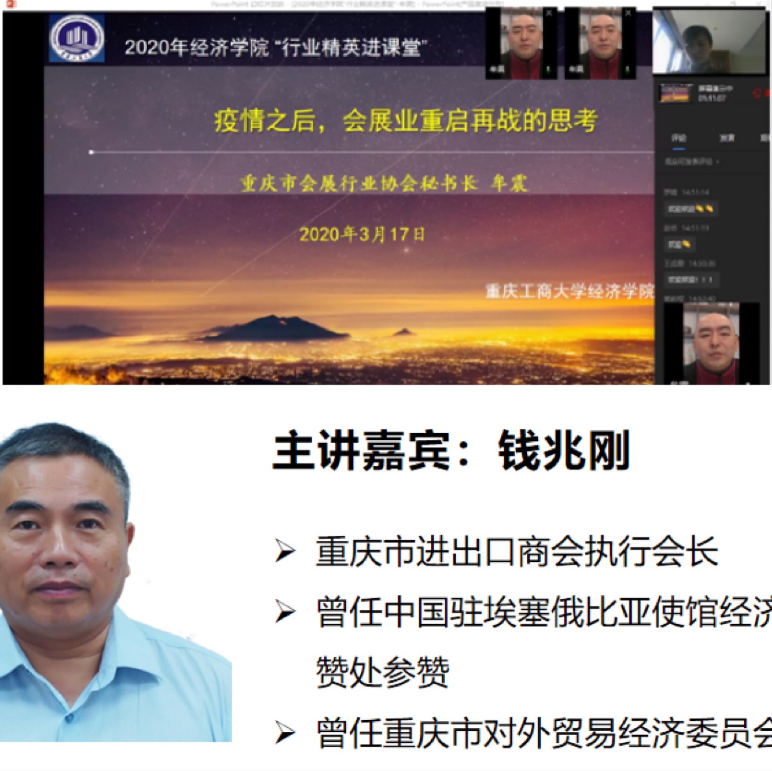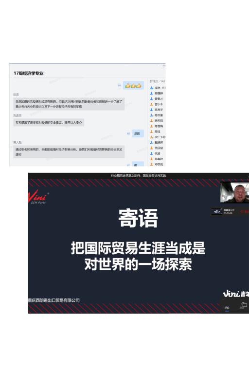 本次“行业精英进课堂”抗疫活动共6场讲座,分别进入《会展服务》、《国际零售与连锁》、《区域经济学》、《国际经济学》、《国际商务谈判》等课堂,就新冠肺炎疫情对消费市场、零售业、外贸业、物流业、会展业等领域的影响及行业企业应对进行分析。具体包括重庆市商务委员会政策研究室主任张书成《疫情对消费的影响及对策》、重庆商社(集团)有限公司人力资源部部长张泽军《新零售时代的国有零售企业管理变革—以重庆商社为例》、重庆市进出口商会执行会长钱兆刚《重庆外贸发展与疫情影响》、沐盛供应链管理(宁波)有限公司总经理杜丽娜《疫情之下,国际物流行业面临的机遇和挑战》、重庆市会展行业协会牟震秘书长《疫情之后,会展业重启再战的思考》、重庆西朗进出口贸易有限公司总经理刘丹《国际商务谈判实践》。本次系列讲座是理论和实践的高度结合,是新冠疫情背景下行业企业抗击疫情实践与各专业知识的有机融合,让同学学懂书本知识的同时,又有了行业实践体验,对自己所学专业有了更深刻的认知。