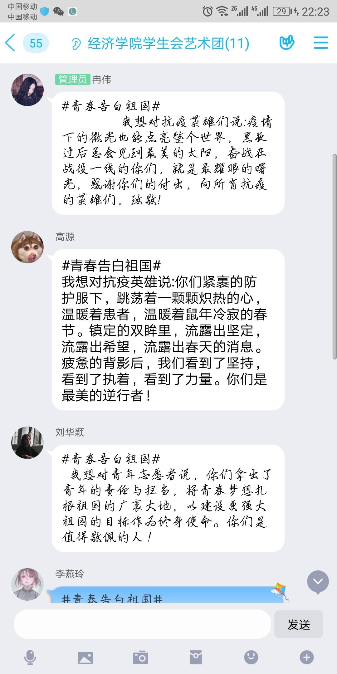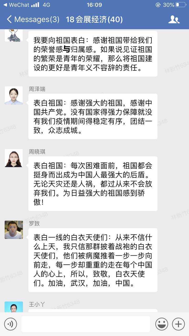 “青春告白祖国,我想对祖国说:何其有幸,生为中华儿女。天灾人祸,有你在便得安心。神州大地团结一心,愿我国早日恢复,繁荣昌盛。”在这个特殊五四青年节,老员工团员们虽然暂时不能返回校园,但激情与活力未减。伟德国际bevictor1946分团委积极响应校团委号召,举办以“学习五四精神,青春告白祖国”为主题的活动,组织团员们学习习总书记五四讲话精神,并运用企业微信、QQ等各种线上平台的交流群,组织团员们以青春之我,告白祖国、告白共青团、告白奋斗中的广大中国青年,字里行间都流露出团员青年最真挚的感情。