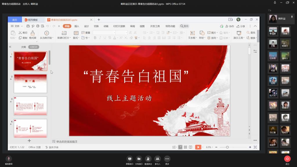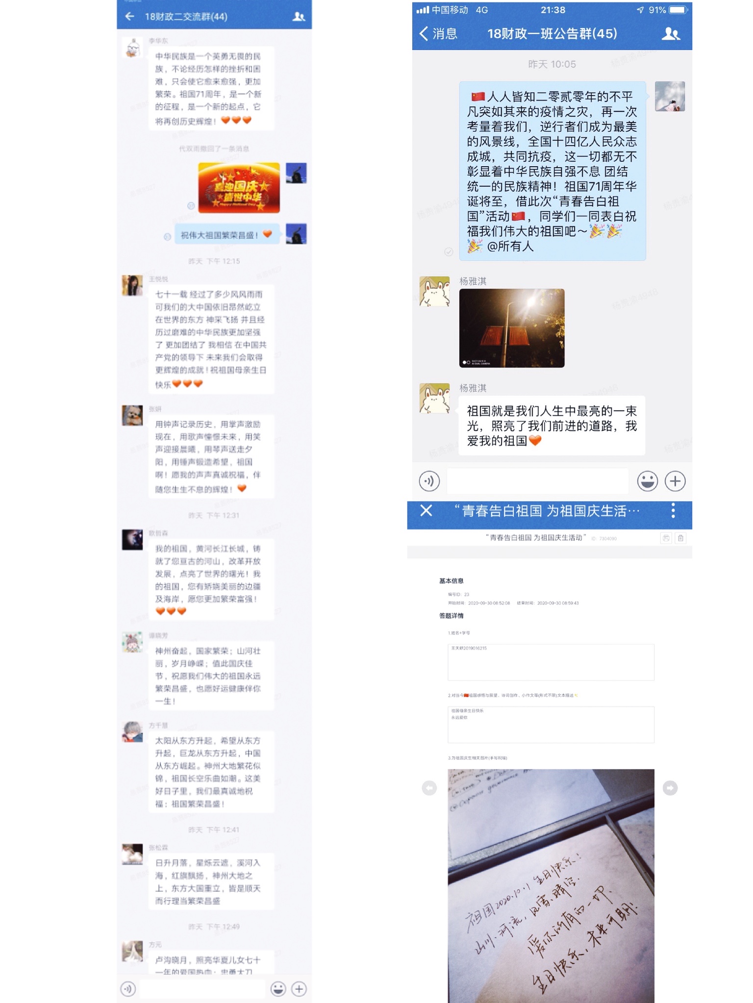 自活动发起以来,各团支部有序组织进行活动,全公司含研究生支部共32个团支部参加了本次“青春告白祖国”活动。经院学子们不拘一格,用丰富多彩的方式向祖国献上诚挚的祝福。大多数的团支部都选择了一个固定的时间段,由各团支部成员分别在班级群中分享自己想要送给祖国71年华诞的祝福。在活动中,经院学子以青春之名告白祖国,他们将对祖国的祝福不只是表现在简短的文字中,还用心地捕捉到校园中的国庆色彩,将对祖国的祝福留在了纸上,用绘画或书法的形式展现出来。其中也有部分团支部别出心裁,直接采用召开线上会议的方式,用PPT将文字、图片、视频结合起来,让同学们在朗诵诗文、展示祖国靓丽风景的过程中,一表爱国之情。