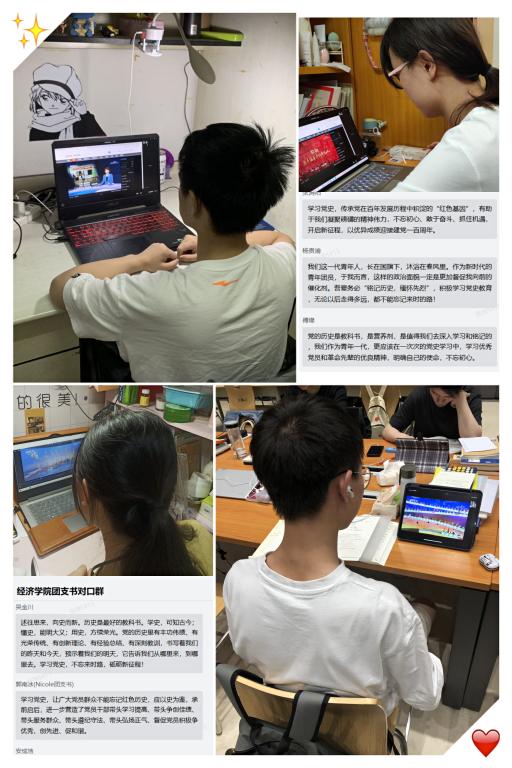 观看之后,同学们纷纷发表感想, 19级国贸一班的团支书李冰同学认为,学史可以明理,学史可以增信,学史可以崇德。今年我党迎来了建党一百周年华诞,真是普天同庆,通过观看党史学习大会,学习了党史知识,回顾我党的艰苦奋斗之旅,受益良多。2019级研究生团支书易桂林表示,江河万里,七月的丰碑耸立不朽,神州大地,一百年的党史辉煌灿烂。新时代青年应自觉回顾党的历史,感受党的精神,方能不忘初心,继续前行。18经济学一班的张津谈到,公司分团委大力推进基层团组织建设,让广大团员青年们更加明确学习党史的重要性,提高思想觉悟的纯洁性。作为老员工的我们,要在学习党史、端正思想的同时,感悟这些优秀党员同志的精神,向他们学习,向他们致敬!