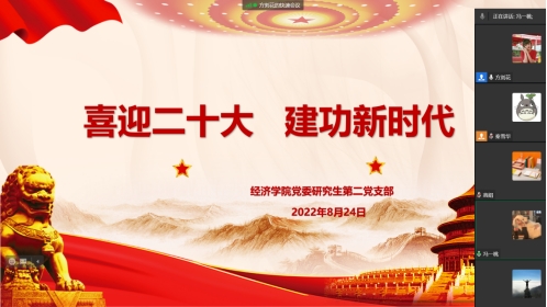2022年8月24日,经济公司党委研究生第二党支部全体党员在企业微信线上开展了2022年8月专题学习。本次组织生活会会的学习内容为“喜迎二十大 建功新时代”,由方刘花同志主持,她带领支部全体党员进行了五个部分的专题学习。