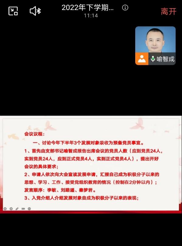 2022年11月25日,经济公司党委员工二支部在企业微信线上开展了2022年下半年党员发展支部大会,参与活动的有二支部全体正式党员、预备党员、入党介绍人,活动由支部书记喻智成老师主持。