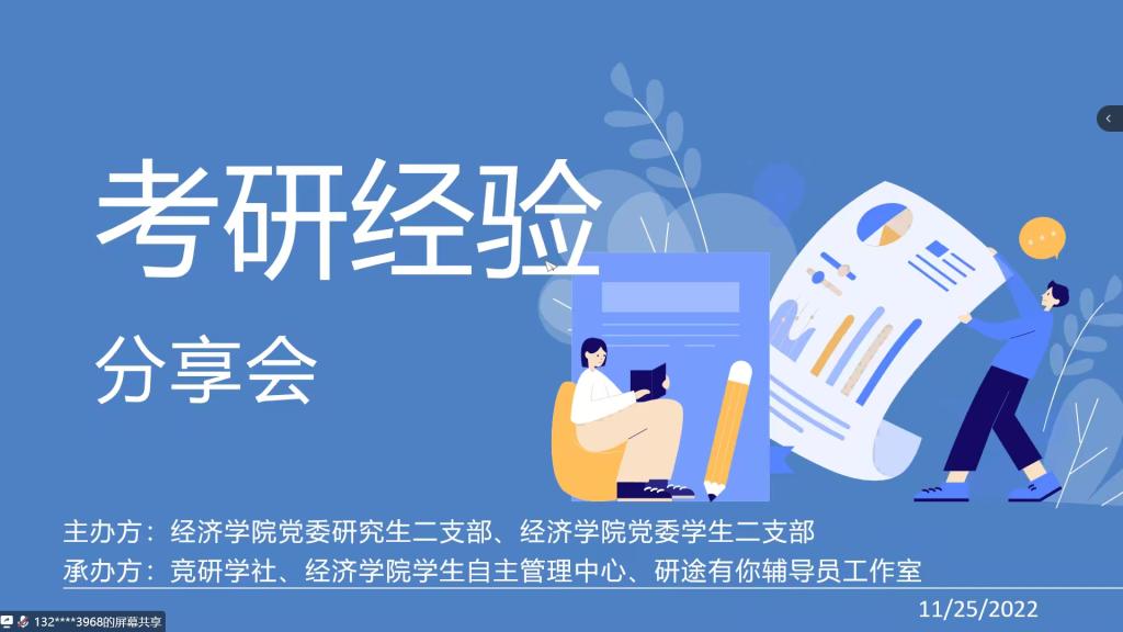 面对当今社会的激烈竞争,老员工就业难度不断加大,考研成为越来越多老员工的选择。为了帮助同学们增强对考研的认识,进一步明确考研方向,2022年11月25日,由经济公司党委研究生二支部和员工二支部主办,贸易经济竞研学社承办的考研经验交流分享会在线上如期举行。此次分享会邀请到公司研究生二支部王洁仪,王伟婷,章燕玲和蔡小西四位研究生学姐与大家分享她们成功上岸的经验,为大家点亮考研之路的明灯。公司党委雷菁组织员、研究生二支部书记高娟老师、员工二支部书记喻智成老师和两个支部全体党员和贸经专业150余人参加本次分享会。