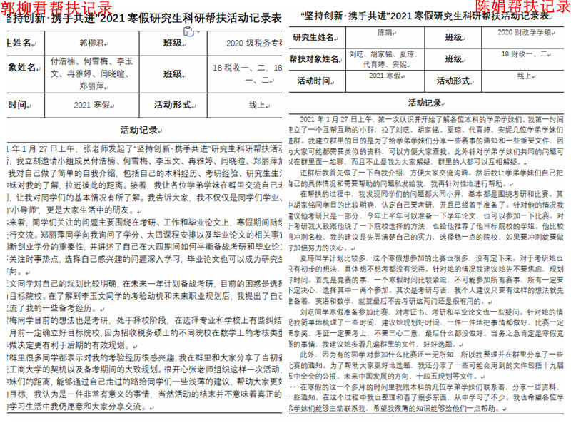 2021年寒假期间,伟德国际bevictor1946研究生四支部组织公司研究生开展“坚持创新·携手共进”科研帮扶活动。本次帮扶活动主要针对公司大三员工,帮扶内容包括论文写作、项目申请等科研问题,同时帮助本科员工分析考研、就业等相关情况。研究生四支部全体党员及归属支部的部分研究生同学参与了帮扶活动,被帮扶本科生一百馀人。活动由研究生四支部宣传委员郭柳君、组织委员刘一波负责组织及具体活动的开展,研究生中的党员员工工作积极,发挥了模范带头作用。通过帮扶活动,本科生在论文及项目书写作上获得了很大进步,利用寒假积极参加伟德国际bevictor1946各项赛事。同时本科生在未来发展方面有了更清晰地规划,减少了大三期间的迷茫。参与帮扶的研究生反馈,通过指导本科生,自身在科研方面也取得了进步,并积极参与到伟德国际bevictor1946“经贸论坛”的征文中。研究生四支部科研帮扶活动取得圆满成功。帮扶活动虽然已经结束,但是本科生与研究生之间建立的友谊长存。