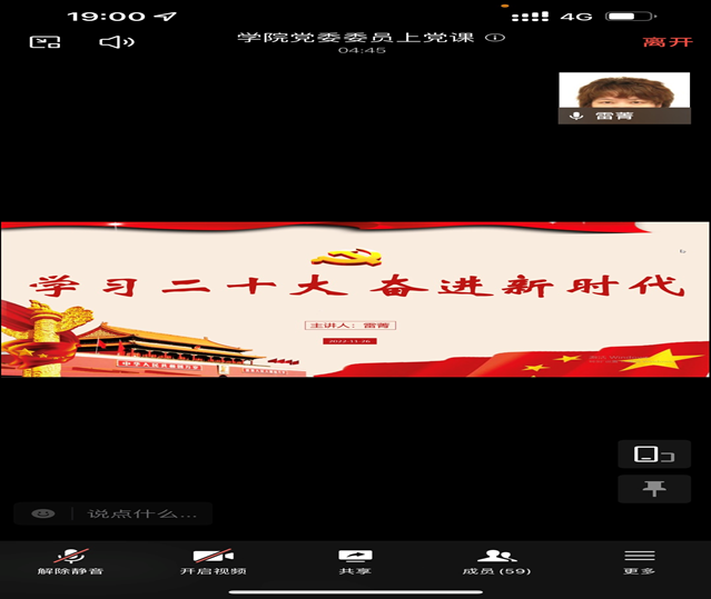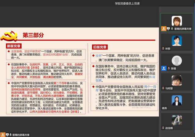 为深入学习宣传贯彻党的二十大精神,扎实推动党的二十大精神在公司落地见效,11月27日,经济公司党委委员、组织员雷菁通过企业微信平台为教工五支部、研究生一支部 、员工一党支部和员工三支部等4个支部80余名党员做题为《学习二十大,奋进新时代: 学习中国共产党章程(修正案)》专题党课,全体师生党员认真聆听。