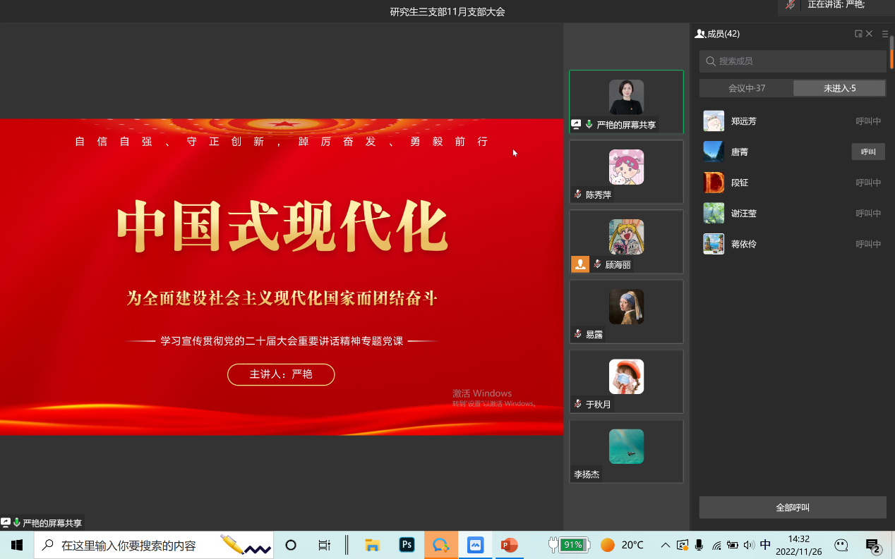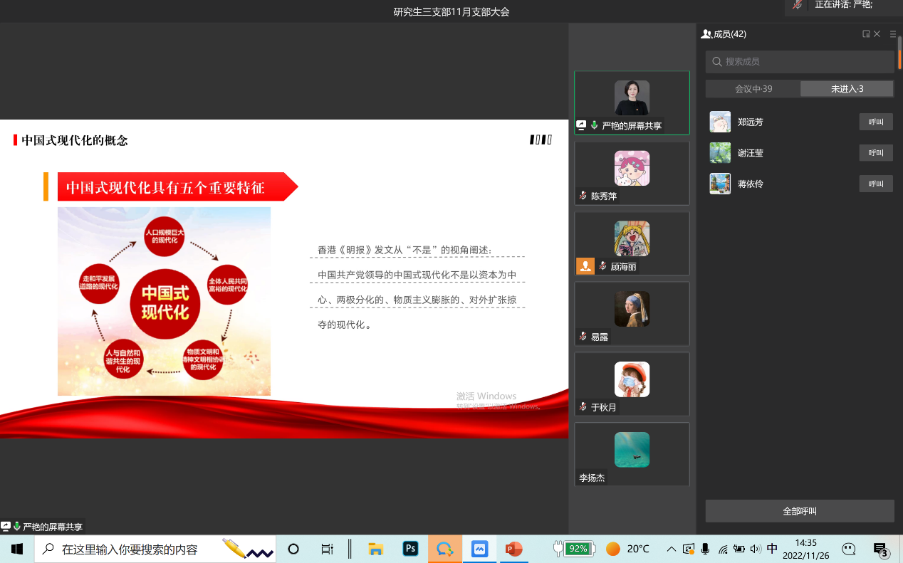 2022年11月26日,伟德国际bevictor1946研究生第三党支部通过企业微信线上会议召开了11月支部大会,会议主要内容是党委委员严艳讲党课。本次会议由支部书记薛晶月主持,研究生三支部全体党员参加。