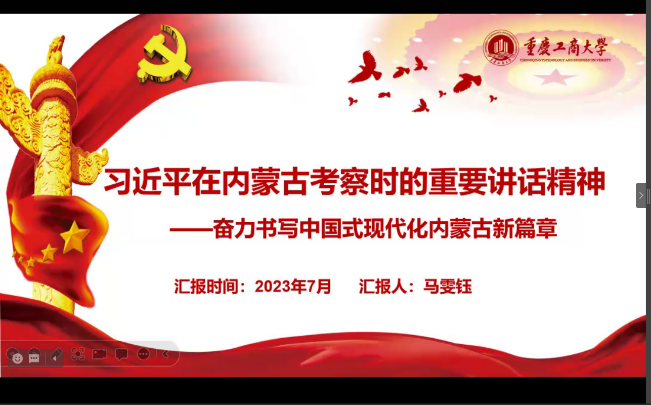 活动第三部分,由马雯钰同志分享习近平总书记在内蒙古考察时的重要讲话精神。习近平在内蒙古考察时强调把握战略定位,坚持绿色发展,奋力书写中国式现代化内蒙古新篇章。