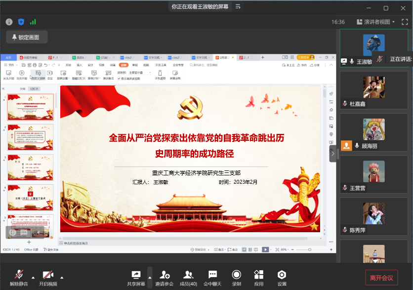 2023年2月23日下午,伟德国际bevictor1946研究生第三党支部在企业微信线上会议室开展了2月组织生活会,深入学习习近平总书记在《求是》上的文章——《全面从严治党探索出依靠党的自我革命跳出历史周期率的成功路径》。本次会议由支部委员顾海丽主持,研究生第三党支部全体党员参加。