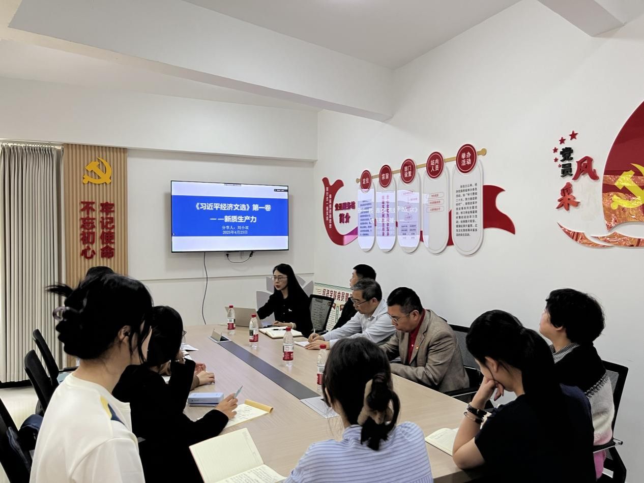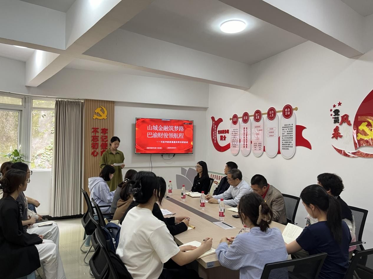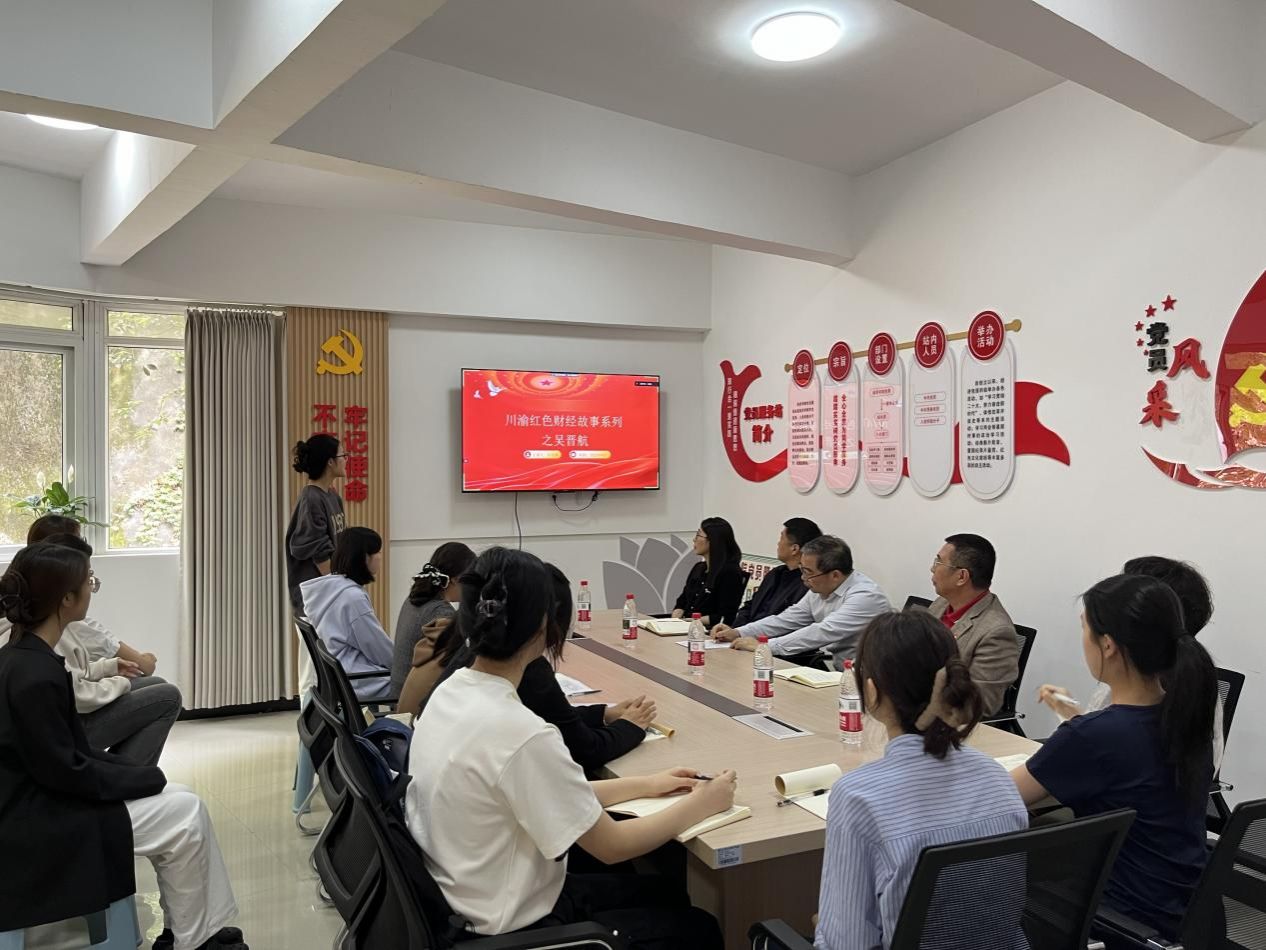主持人卢笛雅介绍了本次主题党日活动的背景,本支部2022级员工党员从2024年以来实地参访重庆金融历史博物馆、收集川渝红色财经资料并精心整理成川渝地区红色财经故事集,依托主题党日活动展示学习成果。活动中,三名员工党员代表依次分享了 “西南金融巨子”杨粲三以“金融 +实业” 模式打破外资垄断的传奇,揭开了“战时金融操盘手” 吴晋航在乱世中守护民营资本的故事,讲述了冀朝鼎以经济学理论为武器,在隐蔽战线上书写的“学术报国” 事迹。分享结束后,雷菁组织员、白海龙副书记、刘小双博士、陈璐同志进行点评,充分肯定了党员们在对川渝地区红色财经人物事迹的分享中能紧扣主题与专业学习,充分挖掘红色财经人物中的精神内涵与时代价值展开深入解读,引导员工党员从故事讲述中汲取奋进力量、培养创新精神。随后,刘小双博士带领支部党员共学了《习近平经济文选》中新质生产力的内涵、国内外研究现状及发展趋势、新质生产力赋能长江经济带碳排放效率多维机制及空间效应研究,一同探讨了老员工党员如何发挥专业优势为中国式现代化建设和经济高质量发展贡献自己的力量。活动尾声,唐春秋书记对活动进行总体点评,肯定了开展本次活动的意义,希望员工党员们以 “财经先驱” 为榜样,结合所学专业,应时代所需,为成渝地区区域协调发展奉献青春力量。