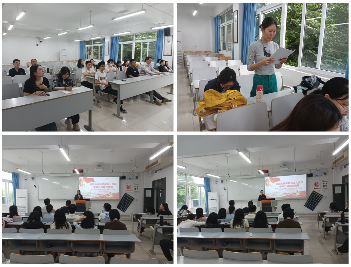 支部书记刘晗做题为“研究生党员如何深入贯彻中央八项规定精神”的党课宣讲,号召支部党员加强学习,提高思想认识,强化自律,做到公正廉洁,立足本职,积极担当作为,加强监督,形成长效机制,特别是毕业生党员,要多渠道寻找合适自己的岗位,发挥自身研究特长,为经济社会发展做出自己的贡献,在新的岗位上发挥好党员的先锋模范作用。支部党员唐菁和赵旖慧分别作为博士、硕士毕业生党员代表进行发言,表示在今后的工作和学习中,将以身作则,从小事做起,从自身做起,带头改进作风。同时,她们还分享了就业和考博的经验,为支部党员未来就业选择提供了参考。