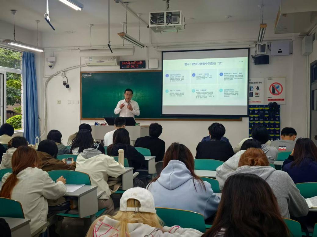 2025年10月22日,重庆百货人力资源总经理张泽军受邀到伟德国际bevictor1946,与贸易经济专业的同学们进行了一场深度交流。他全面分享了重庆百货数字化转型的成功实践,并剖析了贸易行业的发展趋势,为同学们深入了解数字贸易知识、精准规划职业道路提供专业指导。