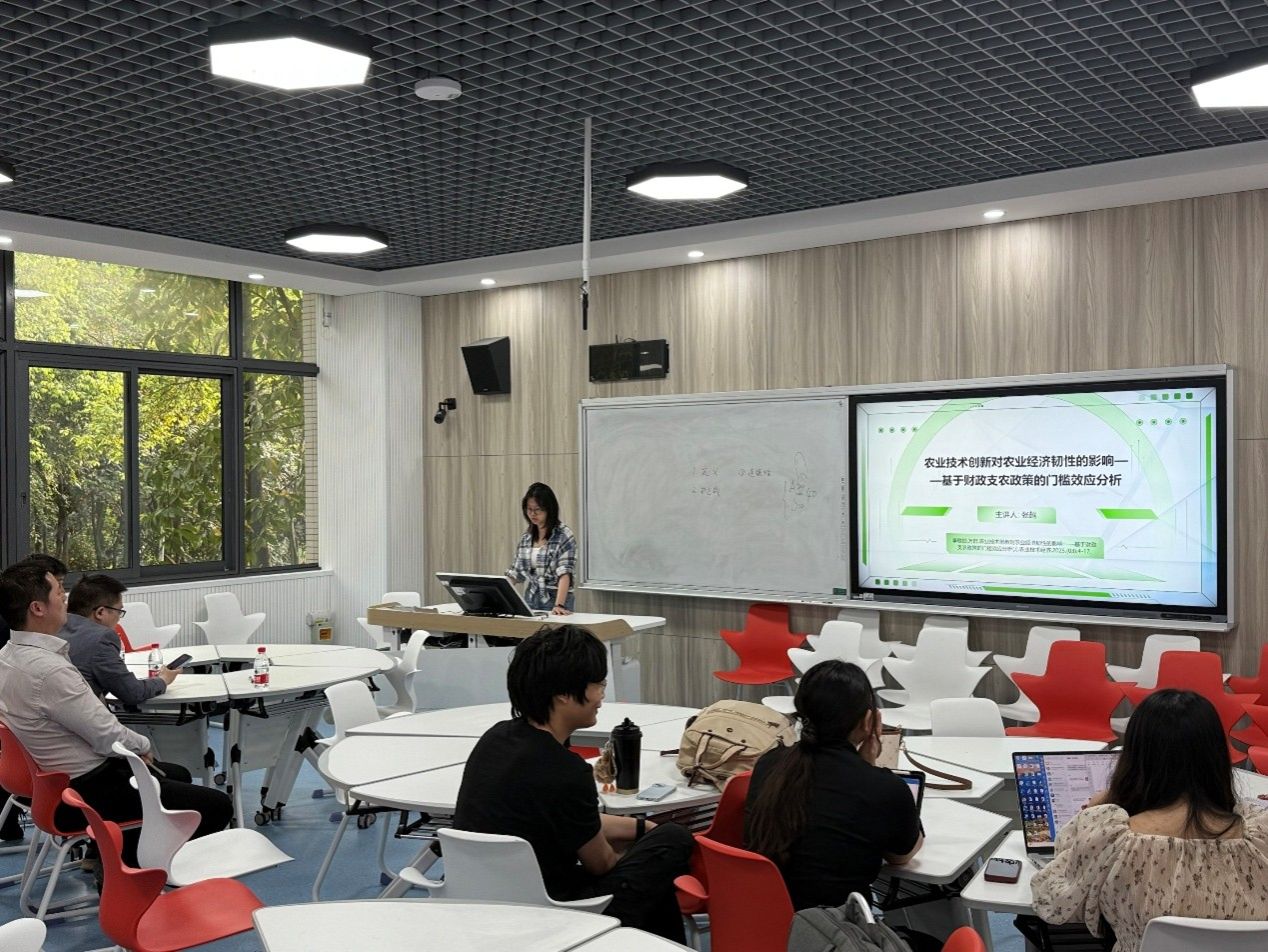 沙龙伊始,2024级财政学专业的张越同学以《农业技术创新对农业经济韧 性的影响 *——基于财政支农政策的门槛效应分析》为题,系统阐述了文献中的理论框架与实证策略。并结合财政支农政策的异质性影响,深入剖析了技术创新如何通过政策传导机制提升农业经济韧性。同样来自该专业的李高同学则带来了《城市群建设城经济韧性:效应与机制》的分享。她从空间经济学视角探讨了城市群协同发展对城市经济韧性的塑造作用,向我们展示了比较规范和完整的写作范式。