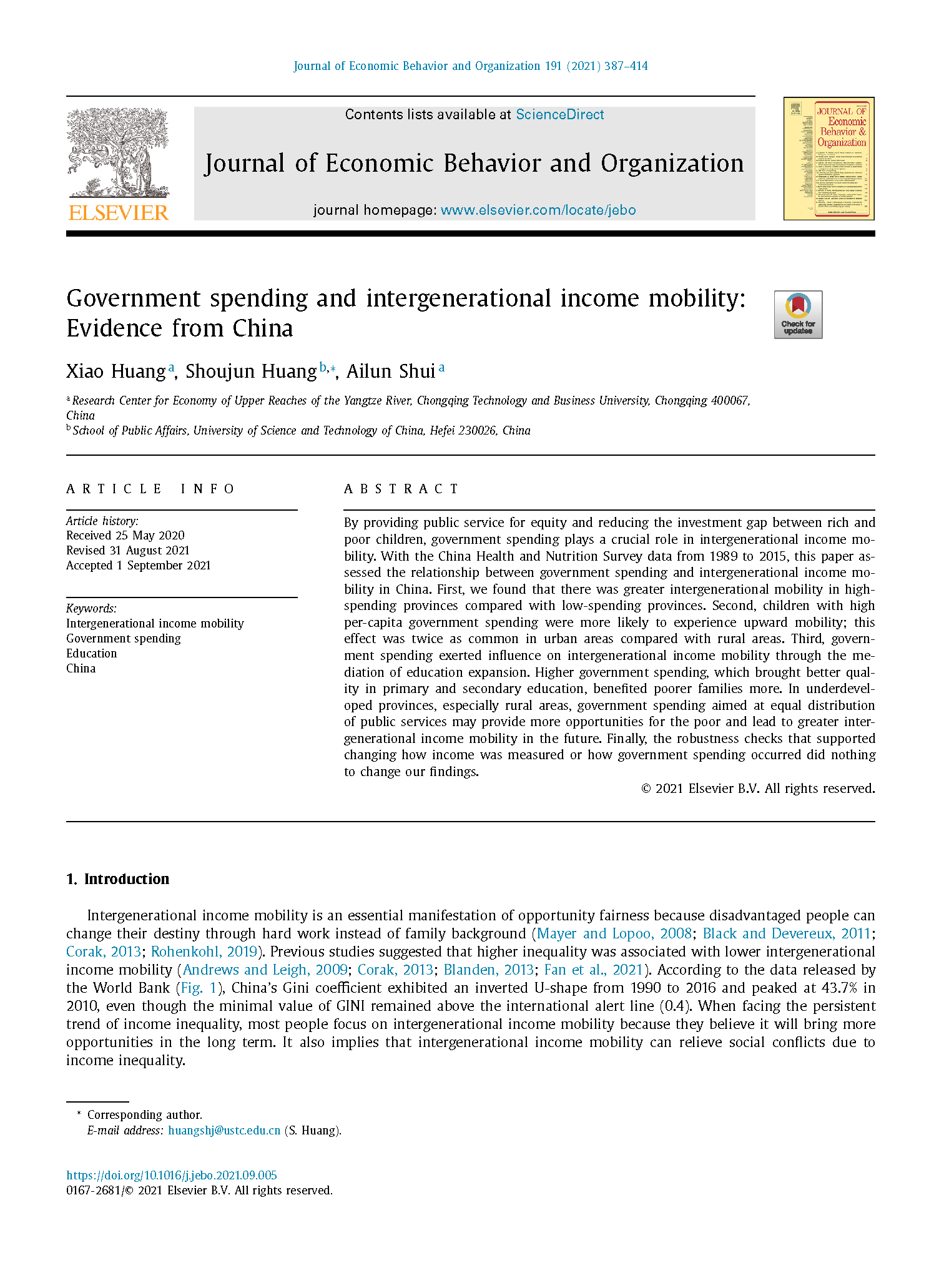 伟德国际bevictor1946副经理黄潇教授在行为经济学领域顶尖学术期刊《Journal of Economic Behavior and Organization》发表论文《Government spending and intergenerational income mobility:Evidence from China》,这也是公司教师首次在该期刊上发表学术论文。论文探讨了政府支出对代际收入流动的影响。通过提供均等的公共服务以及缩减人力资本投资的代际差异,政府支出对代际收入流动有着重要作用。论文研究发现,政府支出水平越高的地区通常代际收入流动性也相对更大,并且这些地区的向上流动概率更高。对欠发达地区而言(特别是欠发达的农村地区),政府在公共服务均等化方面的支出,更能够给经济困难群体创造更大的代际流动可能
