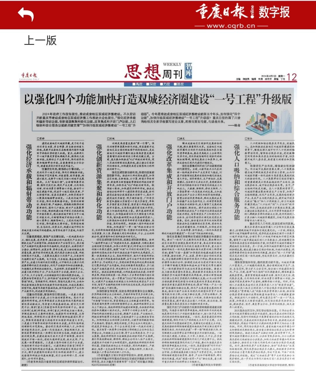 2024年政府工作报告提出,推动成渝地区双城经济圈建设。不久前召开的重庆市建设成渝地区双城经济圈工作推进大会也提出,“强化经济承载和辐射带动功能、创新资源集聚和转化功能、改革集成和开放门户功能、人口吸纳和综合服务功能的关键支撑”“加快打造双城经济圈建设‘一号工程’升级版”。今年是推进成渝地区双城经济圈建设的第五个年头,如何强化“四个功能”,加快打造双城经济圈建设“一号工程”升级版?重庆日报约请了川渝两地相关专家学者撰写理论文章,现推出策划专题,与读者共享。