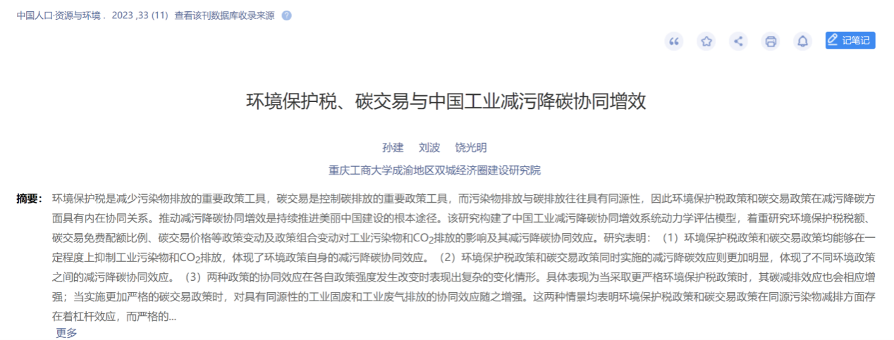 2023年11月,伟德国际bevictor1946孙建教授在重要学术期刊《中国人口·资源与环境》发表学术论文《环境保护税、碳交易与中国工业减污降碳协同增效》。