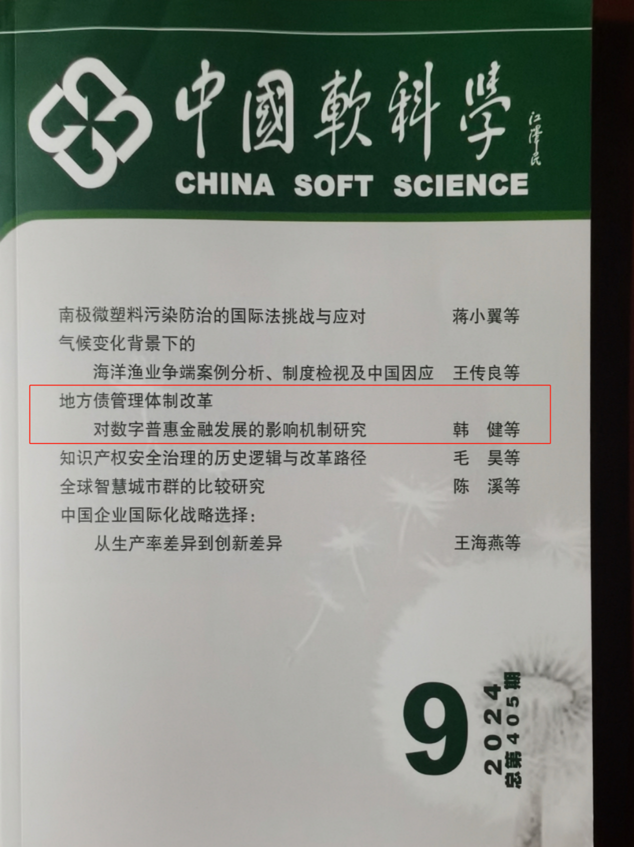 伟德国际bevictor1946韩健教授学术论文《地方债管理体制改革对数字普惠金融发展的影响机制研究》在《中国软科学》期刊2024年第9期发表,并入选期刊封面文章。《中国软科学》(CSSCI)创刊于1986年,是由中华人民共和国科学技术部主管的国家一级学术期刊(2023版复合影响因子:6.707)。
