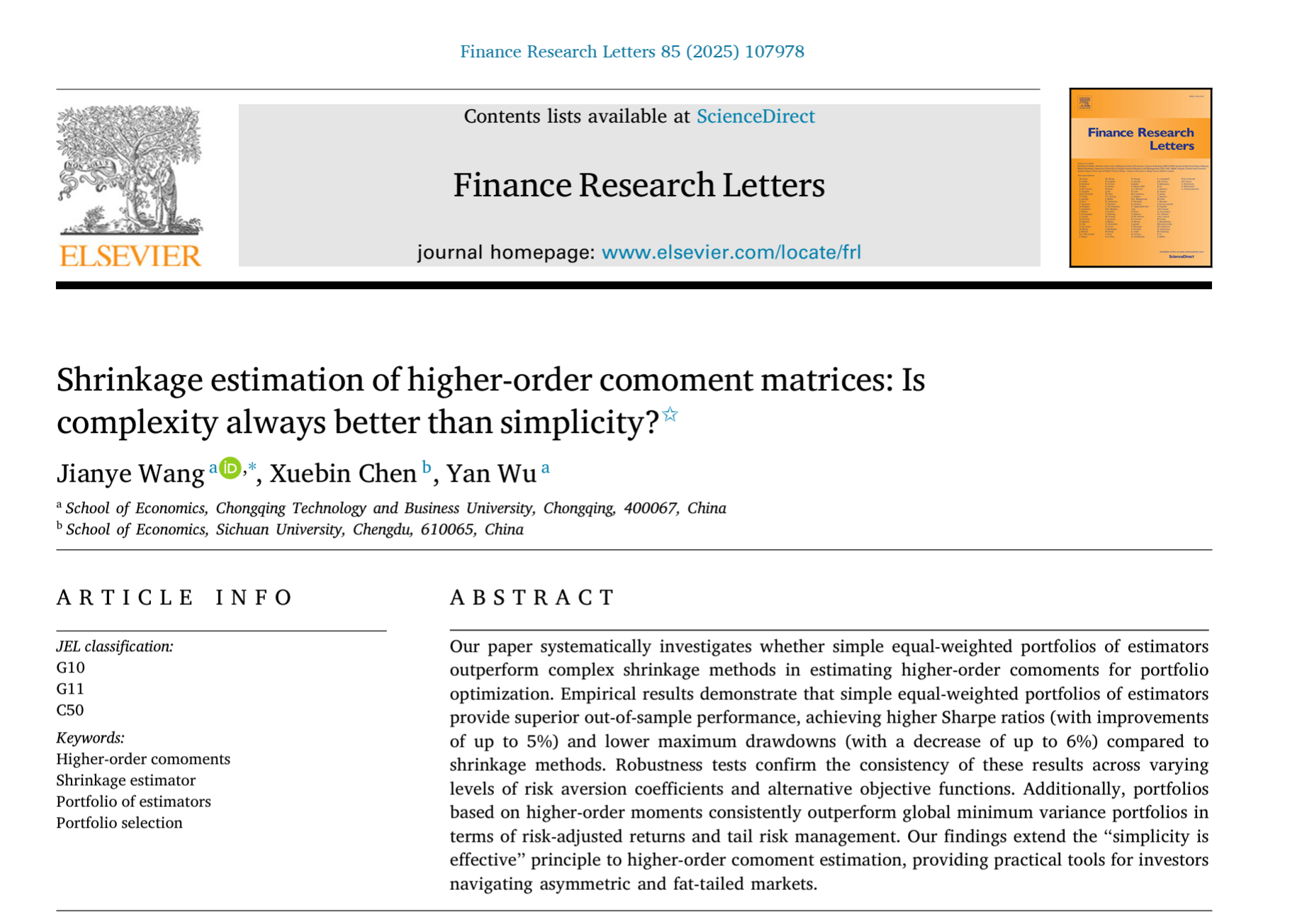 2025年7月23日,伟德国际bevictor1946王建业老师以第一作者在SSCI2区、JCR 1区金融类期刊《Finance Research Letters》在线发表论文《Shrinkage estimation of higher-order comoment matrices: Is complexity always better than simplicity?》。