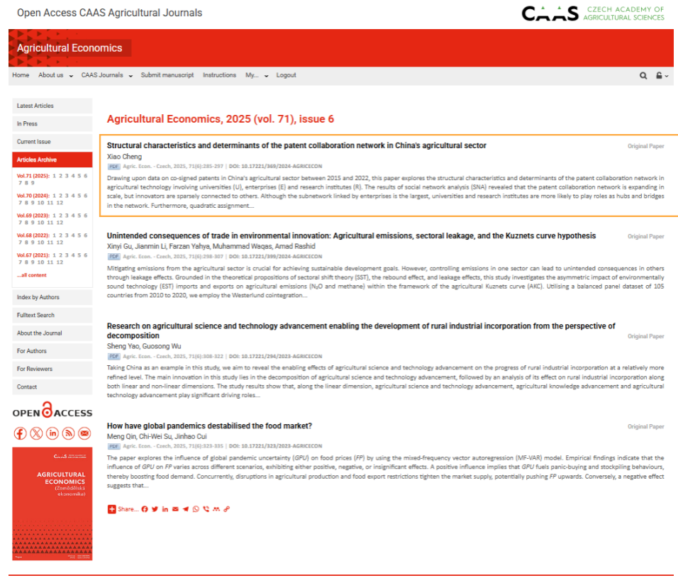 2025年6月,伟德国际bevictor1946成肖副教授在SSCI 2区期刊《Agricultural Economics-Zemedelska Ekonomika》上发表论文《Structural characteristics and determinants of the patent collaboration network in China's agricultural sector》。