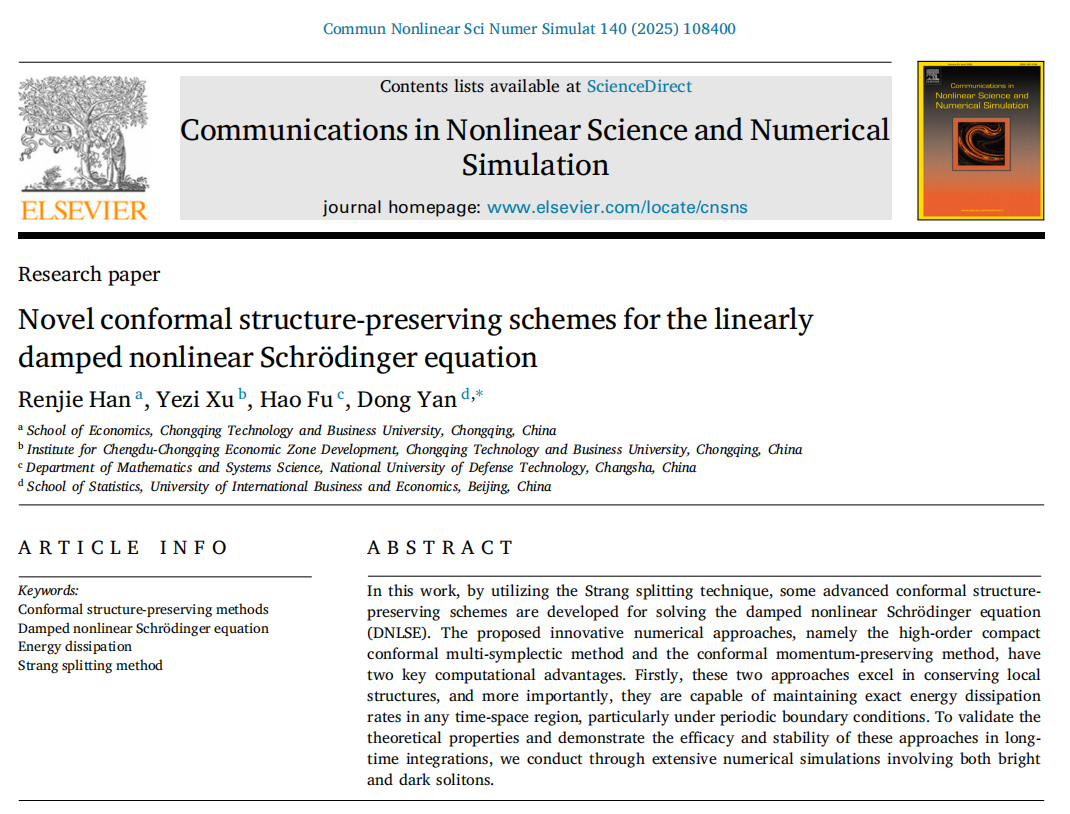 近日,伟德国际bevictor1946韩仁杰老师团队在Elsevier期刊《Communications in Nonlinear Science and Numerical Simulation》(简称CNSNS)发表题为“Novel conformal structure-preserving schemes for the linearly damped nonlinear Schrödinger equation”的研究论文。CNSNS期刊为Elsevier旗下非线性科学与数值模拟领域的重要期刊,中国科公司二区刊物,被SCI/SCIE收录,在JCR2024覆盖的学科中位列Q1,是非线性与计算数学领域具有国际影响力的核心期刊之一。