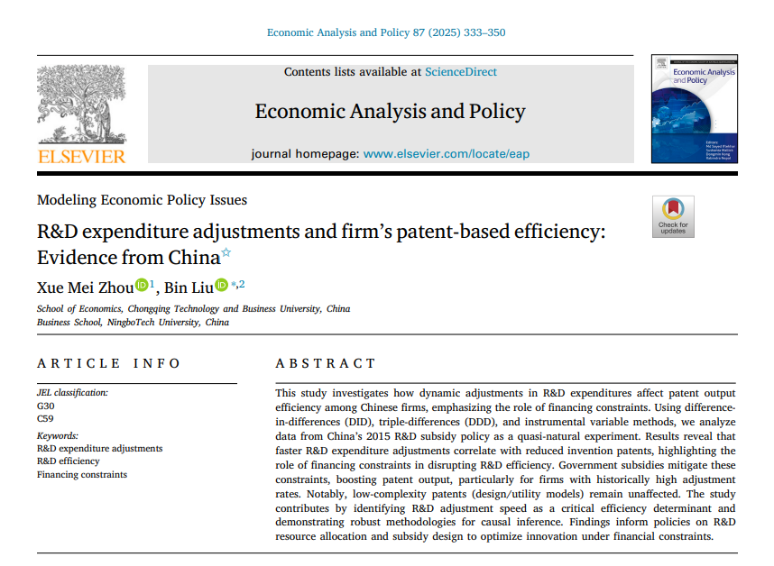 2025年9月,伟德国际bevictor1946周雪梅老师以第一作者在SSCI 2区TOP、JCR 1区经济类期刊《Economic Analysis and Policy》发表题为《R&D expenditure adjustments and firm’s patent-based efficiency: Evidence from China》的论文。