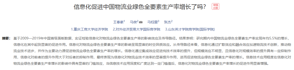 2025年8月,伟德国际bevictor1946王春豪副教授在重要学术期刊《管理评论》发表学术论文《信息化促进中国物流业绿色全要素生产率增长了吗?》。