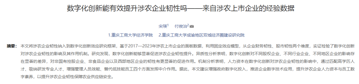 2025年7月,伟德国际bevictor1946宋瑛教授在重要学术期刊《农业技术经济》发表学术论文《数字化创新能有效提升涉农企业韧性吗?——来自涉农上市企业的经验数据》。
