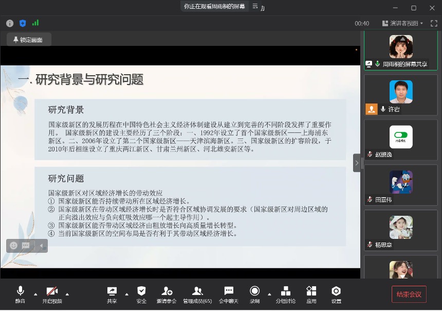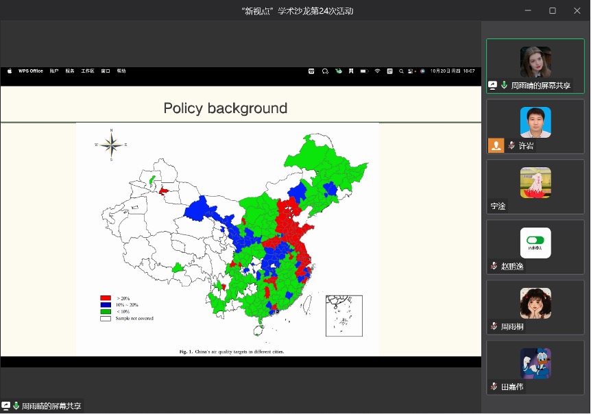 在本次活动中,2021级西方经济学专业两位同学周雨晴和周雨桐分别分享了近期阅读的文献。周雨晴与大家分享了一篇发表在《Journal of Cleaner Production》上的论文《Has environmental policy improved the job quality of migrant workers? A quasi-natural experiment on China’s Clean Air Action》,她首先说明了选择分享这篇文献的主要原因,接着梳理了整篇文章的框架,并对文章的各部分内容作了简要介绍,最后提出自己关于文章改进的思考。周雨桐与大家分享了发表在《中国工业经济》期刊上的一篇论文《国家级新区对区域经济增长的带动效应——基于70大中城市的经验证据》,她按照全文的框架脉络进行梳理和讲解,重点讲解了渐进双重差分模型部分的设计和结论,并将文章涉及到的相关代码在stata上现场操作演示,最后总结自己的收获和对本文不足之处的思考。两位主讲人文献分享结束后,各位老师和同学就文章相关问题进行讨论和交流;最后,许岩老师呼吁大家注重实证研究的同时,更要重视理论研究。