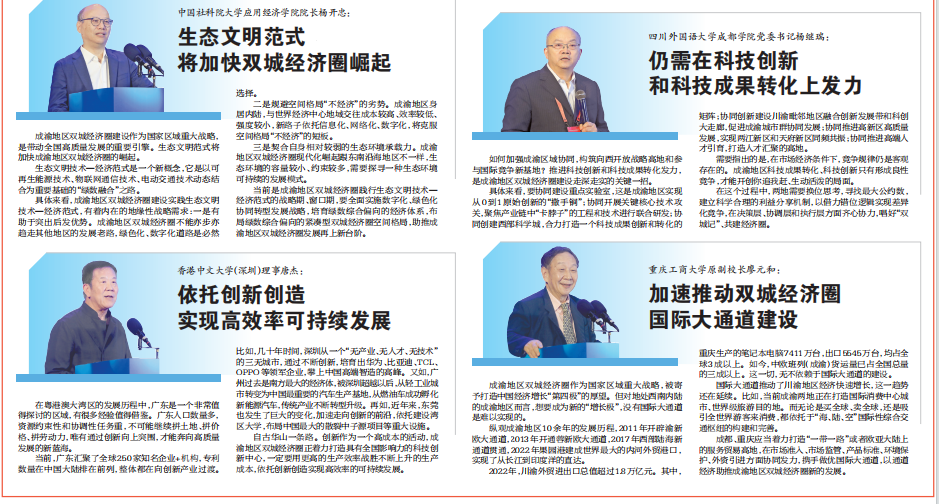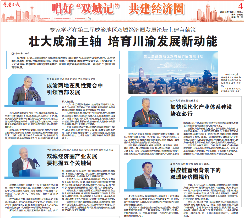 10月24日,由中共重庆市委宣传部、中共四川省委宣传部指导,重庆市社会科学界联合会、四川省社会科学界联合会主办,重庆两江新区管理委员会、四川天府新区管理委员会、伟德源自英国始于1946、西南财经大学、成都市社会科学界联合会、教育部人文社会科学重点研究基地长江上游经济研究中心等单位联合承办,并由伟德国际bevictor1946作为论坛承办实施单位的第二届成渝地区双城经济圈发展论坛在悦来国际会展中心顺利举行。来自全国各地高校、智库、社科界和政府部门的近300位专家学者,围绕壮大成渝主轴、加快建设现代化产业体系、持续提升区域协同创新能力、培育川渝发展新动能等问题开展研讨,建言献策,分享他们的精彩观点。