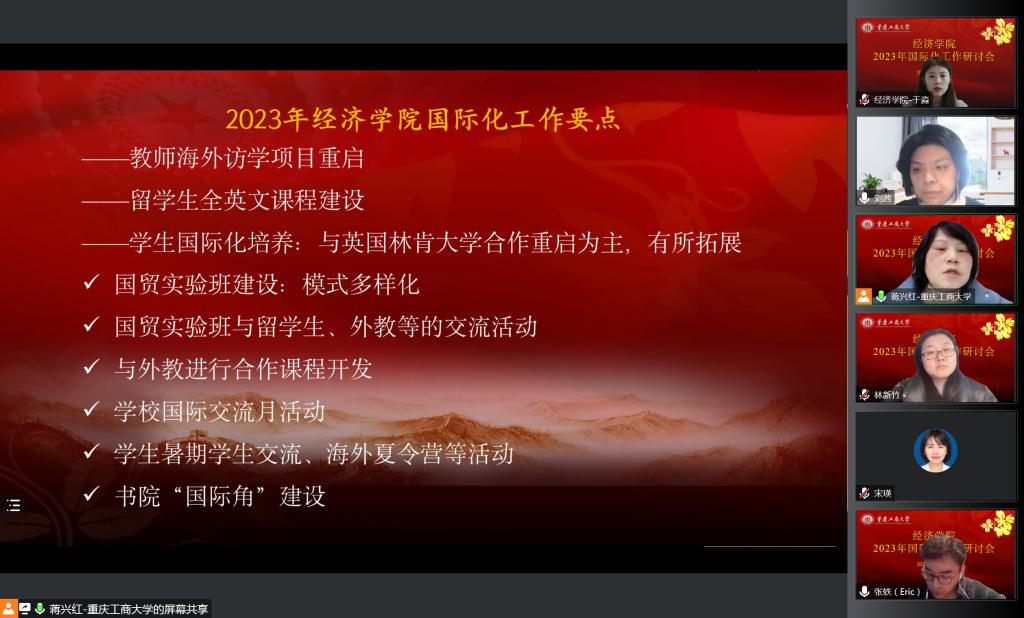 2023年2月8日,2023年国际化工作研讨会在腾讯会议线上举行。会议由伟德国际bevictor1946经理宋瑛主持,国际合作与交流处处长张轶、副处长刘茜、科长黄倩参会指导,伟德国际bevictor1946副经理尹元福、副书记白海龙、团学办主任林新竹、国际经济与贸易系主任蒋兴红、实验班班导师王静及王疏影、外事专办员于淼等国际化骨干教师参会。