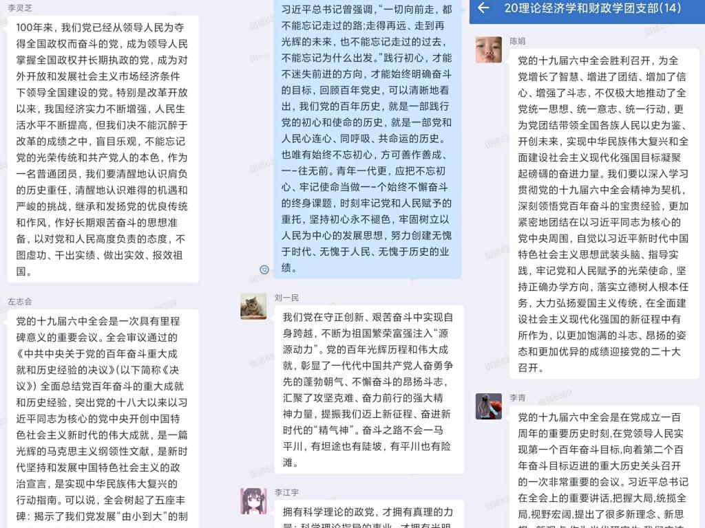 同学们认真观看并且学习了习总书记关于“十九届六中全会的报告”,会后,各支部采取多样化形式展开了学习交流。19经济一班的同学们在观看完十九届六中全会公报后,在班级群里展开了热烈的讨论,他们就“四个伟大成就”、“党的百年奋斗的五大历史意义”以及“十大经验”谈起了自己的理解。同学们谈到:身为一名在校老员工,学习党的十九届六中全会令自己深受鼓舞。一百年来,党领导人民浴血奋战、百折不挠,创造了新民主主义革命的伟大成就;又领导人民自信自强、守正创新,创造了新时代中国特色社会主义的伟大成就。正是因为党的百年奋斗,我们的生活才越来越美好。20贸经二班的同学们则是在观看完十九届六中全会公报后,纷纷在纸上写下了自己的感悟和对党的美好祝愿。他们写到,党的十九届六中全会是党中央在建党百年重要历史时刻召开的一次具有里程碑意义的大会。作为新时代的青年老员工,我们倍感振奋、倍受鼓舞。这也更加激励我们要不忘初心,牢记使命,坚定理想信念,勤奋学习,练就过硬本领,不负历史使命,不负时代召唤,不负青春韶华,为实现中华民族伟大复兴的中国梦贡献自己的力量!