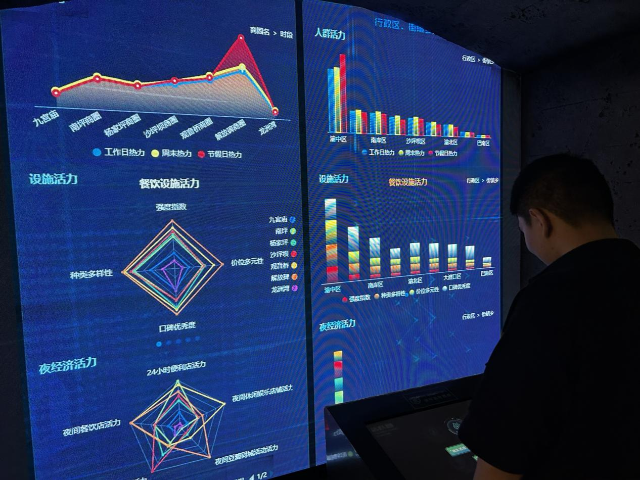 在城市活力数据统计面板前,团员青年们通过操作显示屏,进行设施活力、人群活力、夜经济活力、人口变化趋势等多个数据的不断变换分析,对重庆市中心城区的社会经济活力进行了解,从而加深对于经济社会生活的感悟。
