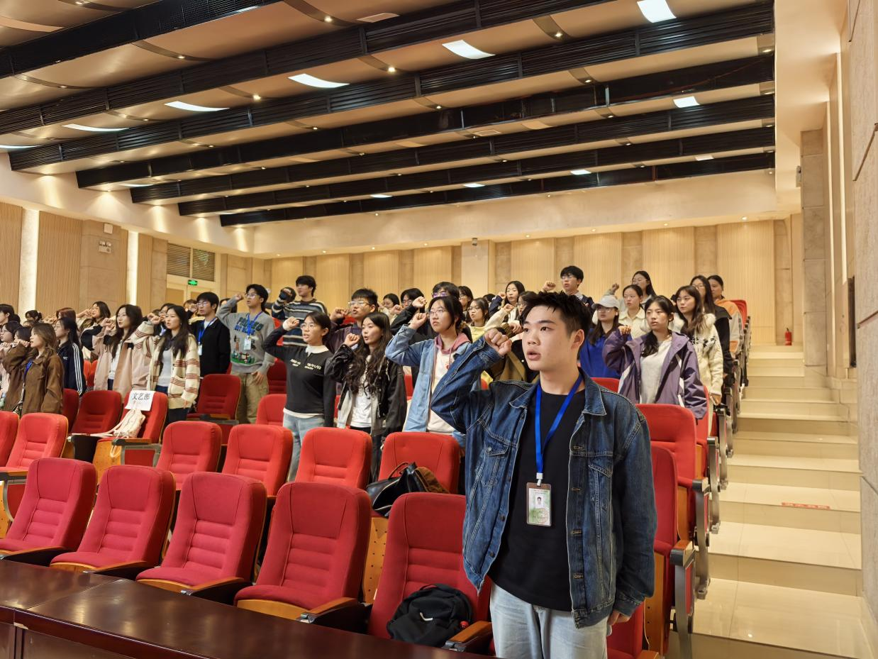 会议伊始,青队负责人方舒华首先发言,她对2025级新队员的加入表示诚挚欢迎,并回顾了服务队历年来的志愿服务成就与感人瞬间。在庄严而隆重的宣誓环节,志愿者代表李佩琪带领全体新队员面向队旗,高举右拳,郑重许下志愿服务誓言,誓词铿锵有力,响彻会场,充分展现了志愿者们奉献社会、挥洒青春的坚定信念。授徽仪式将现场气氛推向高潮。各部门负责人为新生志愿者逐一佩戴队徽。这枚徽章不仅是志愿者身份的象征,更承载着服务社会、勇于担当的责任与荣光。