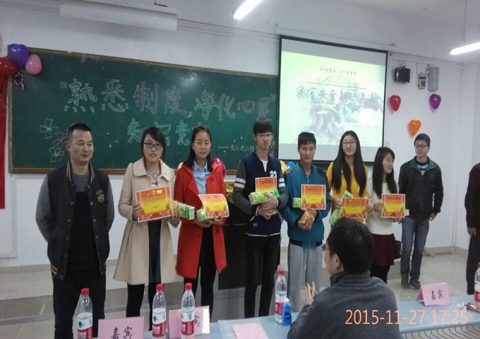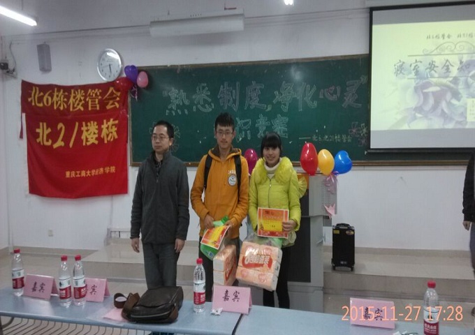 为全面普及安全知识,强化校园安全文化教育,营造校园安全文化氛围,建设和谐、平安楼栋。在北6楼管会与北21楼管会的共同努力下,根据2015--2016学年公寓文化活动主题开展了“熟悉制度、净化心灵之公寓卫生安全知识竞赛”,活动于11月27日在7教405成功举办。员工处公寓管理科科长冯湛老师、北6楼管会主任郝颖老师、北21楼管会主任喻智成老师出席了本次比赛并担任比赛评委。并邀请了北6党服站长石运婷、北21党服站长李翔,大自委宣传策划部干部以及其他楼栋干部作为嘉宾。