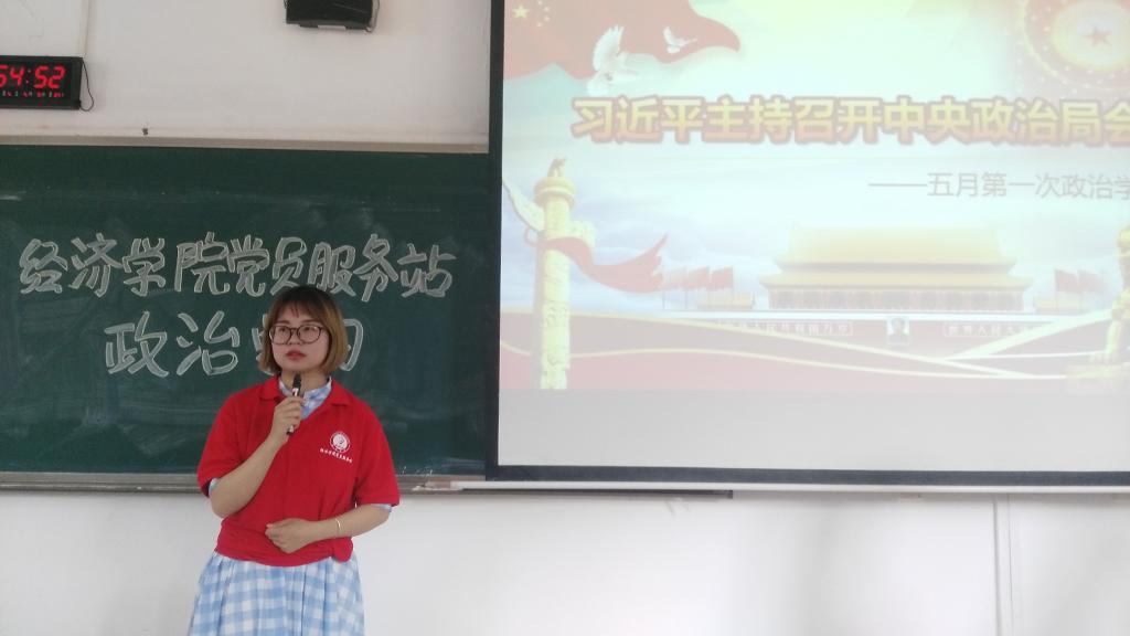 2017年5月4日,经济公司党员服务站在07206教室开展了五月第一次政治学习,本次学习主题为“习近平主持召开中央政治局会议,分析研究当前经济形势和经济工作”,由新闻采编部部长汪科励主持讲解。