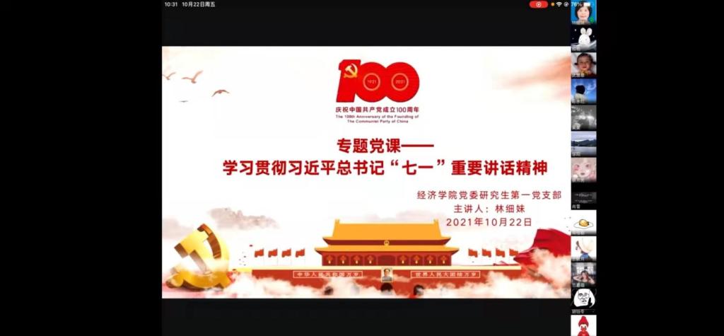10月22日,经济公司党委研究生第一党支部在线上召开了以“学习贯彻习近平总书记‘七一’重要讲话精神”为主题的专题党课学习活动。此次党课由支部书记林细妹主讲,支部全体成员参加。