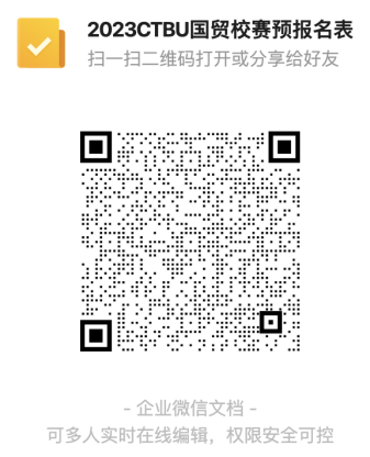 (1)预报名:请参赛同学确定团队名称和组长后,于2023年10月10日12:00前填写预报名表:【收集表】 2023CTBU国贸校赛预报名表 https://doc.weixin.qq.com/forms/AOEAbQeoAAkAM8AIwYDANsfh83PkroSrf