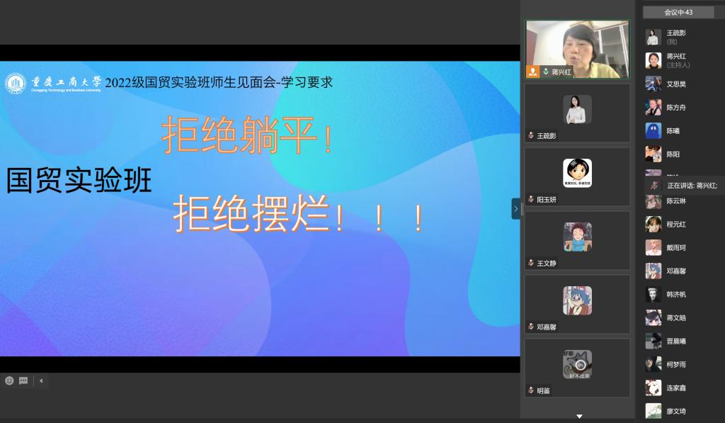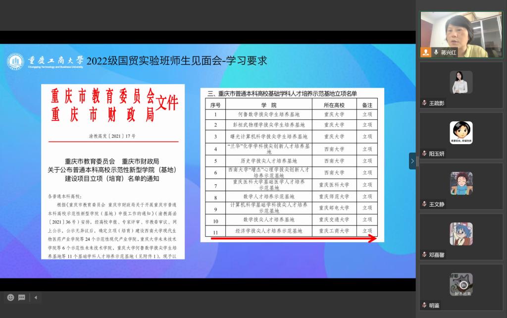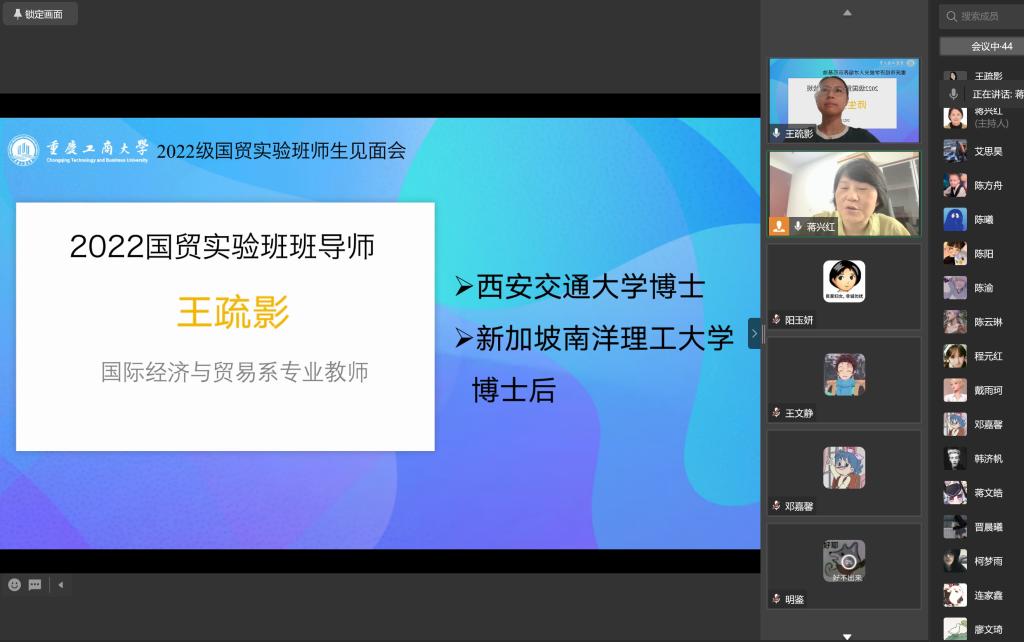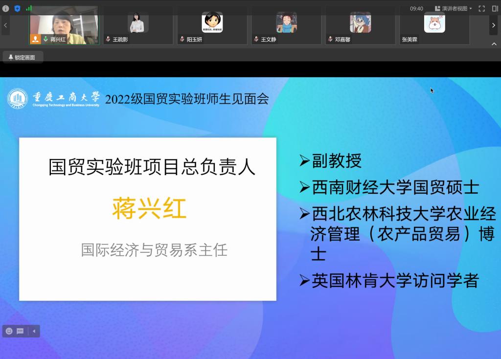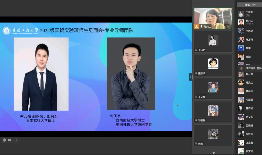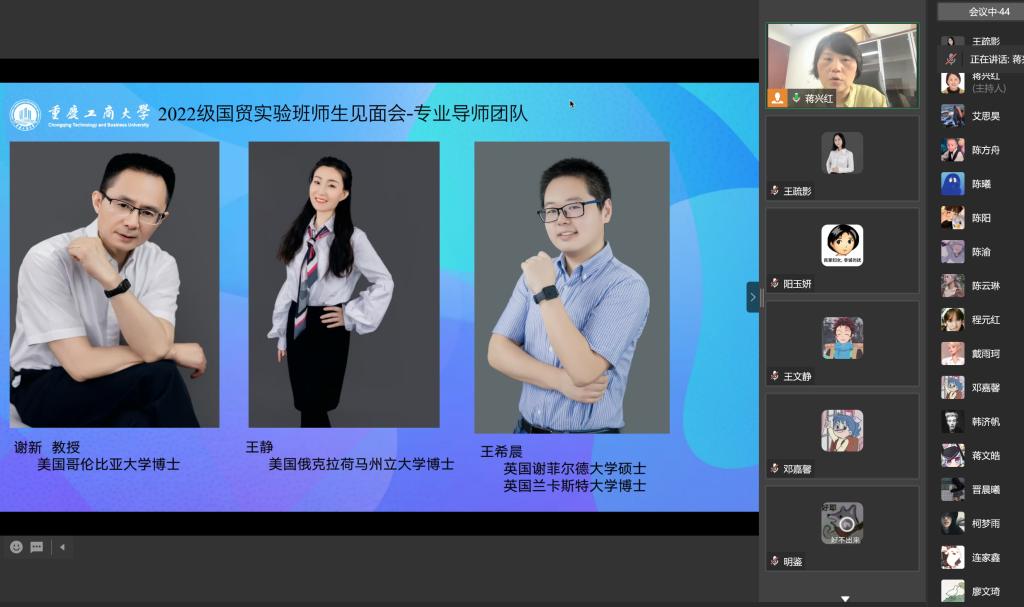 然后,蒋兴红主任依次介绍了2022国贸实验班主要负责老师。2022国贸实验班辅导员张楠老师、实验班公司员工联络专员林新竹老师、实验班班导师王疏影老师与实验班员工线上交流。蒋兴红主任进一步介绍了2022国贸实验班专业导师团队。