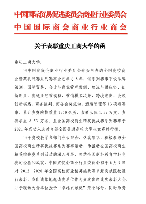 自2012年开始,中国国际贸易促进委员会商业行业委员会牵头举办“全国高校商业精英挑战赛”系列活动。目前,该系列赛事已发展成为我国高等商科教育领域专业覆盖最全面、产学合作最深入、国际联络最广泛;集学科竞赛、产学合作与国际交流三位一体的创新实践平台,部分赛事2021年成功入选教育部全国普通高校老员工竞赛排行榜。