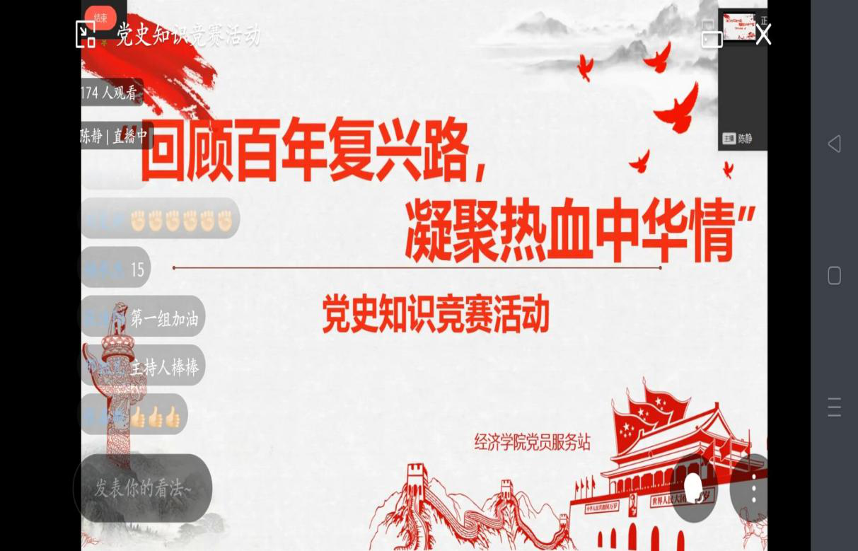 “百年风雨兼程,世纪沧桑巨变”,一百年前,中国面临着内忧外患的双重困境,在此时代背景下,伟大的中国共产党应运而生,为处在迷茫与徘徊中的中华民族带来了一丝希望。一百年来,中国共产党人始终坚持为中国人民谋幸福、为中华民族谋复兴的初心与使命,团结和带领中国人民顽强拼搏,取得了举世瞩目的伟大成就。为深入贯彻学习党的奋斗精神,引导与激励青年员工从百年党史中感悟初心、坚定信仰,强化对党史学习的深度和广度。11月12日,应防疫要求,经济公司党员服务站通过线上直播的方式举行了 “回顾百年复兴路,凝聚热血中华情”主题党史知识竞赛,此次活动共有27个小组报名,总计158人。活动由20级贸经一班的陈静主持。
